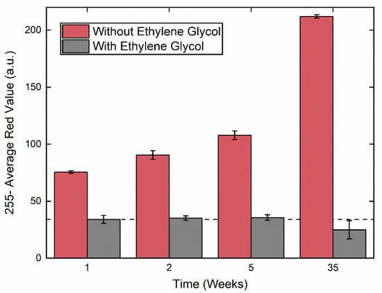Stability studies for molybdenum blue reagent with ethylene glycol (grey bars) and without ethylene glycol (red bars) when dried on paper and stored in a refrigerator at ≤4 °C for up to 35 weeks. Stability is indicated by lack of color variation over time. The grey dashed line indicates the color of the reagent when initially dried on paper at t = 0 weeks. The error bars represent the standard deviation of three measurements.