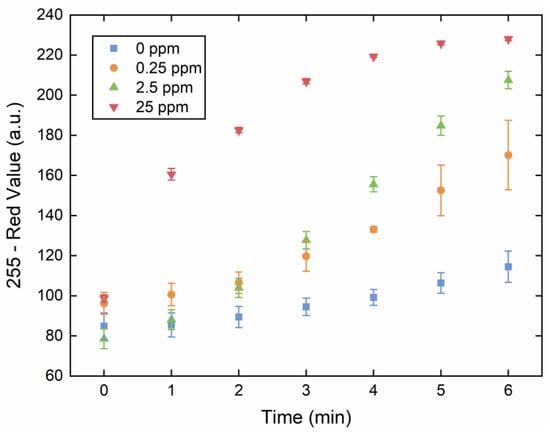Optimization of color development (measured as 255-a.u.) over time (measured in min) to determine optimal reaction time. Sensor images were collected at 1-min intervals for devices treated with 0 ppm phosphate (blue data points), 0.25 ppm phosphate (orange data points), 2.5 ppm phosphate (green data points), and 25 ppm phosphate (red data points). The observed red values were obtained using ImageJ software for analysis. The error bars represent the standard deviation of three measurements.