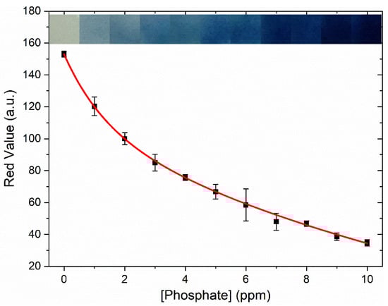Sensor calibration curve and color gradient for phosphate concentrations of 1–10 ppm in synthetic freshwater. The data were fit to a second order exponential decay of the formula y = A1(-x/t1) + A2(-x/t2) + y0; where A1 = 44.0; t1 = 1.34; A2 = 158.; t2 = 15.7; y0 = −49.0; R2 = 0.999. The error bars represent the standard deviation of three measurements.