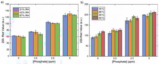 Comparison of colorimetric sensor readouts for phosphate concentrations between 0 and 5 ppm in a range of (a) temperature and (b) relative humidity (RH) conditions. The error bars represent the standard deviation of three measurements.