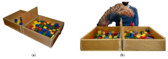 The Box and Blocks Test (BBT) is an outcome measure widely used in neurological rehabilitation to quantify the upper limb motor function, especially the level of gross manual dexterity and coordination []. Figure 1 depicts the components of the system and the movements of the patient when performing the test. The physical elements of the BBT are a wooden box with two 290 mm wide square compartments and 150 wooden 1-in cubes. Additionally, a 100 mm high partition is located between the two compartments to separate them (see Figure 1a). To administer the BBT, it is necessary to place the patient in front of the box, the two wooden compartments must remain in the mid-line of the patient, and the patient must move the cubes from one side to the other, finally, it is important that the therapist gives them the correct instructions before starting the test.