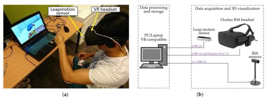 Figure 2a illustrates the assessment setup of the VR-BBT, including its components. For the UE evaluation, the user must be seated to safely wear the Oculus Rift headset. Since the user stays in a seated position, the risk of falling due to possible dizziness is minimized. The LMC sensor is placed in the Oculus Rift headset for working in the head-mounted configuration. A gaming PC is required to run the virtual environment in the VR headset. Figure 2b presents the hardware connection of devices. The virtual environment was implemented using the Unity 3D software, and the Interaction Engine module was employed to improve the gesture recognition capabilities of the LMC.