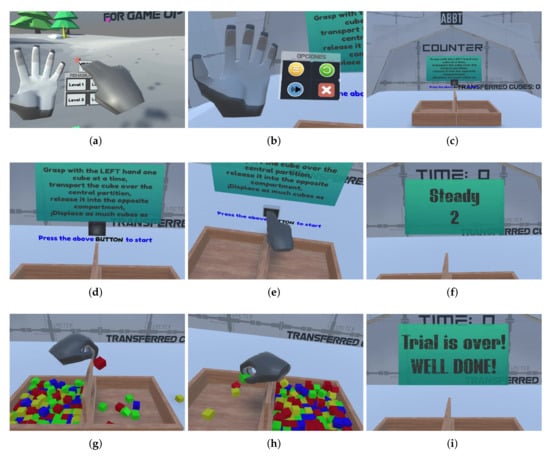 Process for automatic test administration: (a) launching assessment; (b) options’ menu; (c) assessment scenario; (d) instructions given; (e) starting evaluation; (f) intermediate panels; (g) dominant hand evaluation; (h) non-dominant hand evaluation; (i) farewell panel.