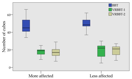 Secondly, the statistical analysis of scores from the physical BBT and the VR-BBT showed a statistical significance for both the more and less affected sides ( and , respectively), and even for the whole sample (); however, the correlation level is moderate in all cases. This correlation level agrees with the findings of a similar study with stroke survivors [] that suggest the difference between physical and virtual systems lays on the nature of virtual reality. In the case of the physical BBT, the performance in cube displacement is affected by grip surfaces []. Thus, both virtual and physical systems may be fundamentally different; however, the high level of significance obtained in our statistical analysis proves that despite the differences, the virtual system could maintain the clinical meaningfulness of the conventional test.