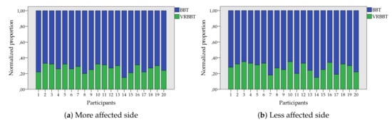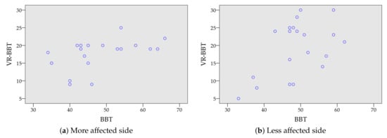 Pearson’s correlation coefficients between the scores from the BBT and the VR-BBT systems are presented in Table 4. The coefficients showed a statistical significance for both sides (p for the more affected side and p for the less affected side), with a moderate correlation for the more affected side (r) and the less affected side (r).