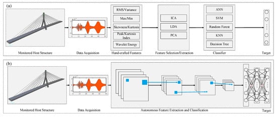(a) Conventional data-driven SHM vs. (b) Deep learning-based SHM.