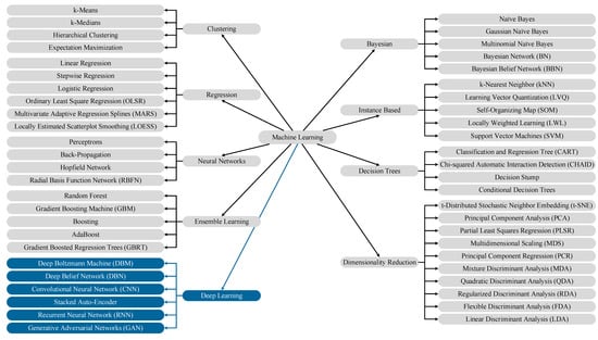 Various alternative DL models have been recently proposed, such as Deep Convolutional Neural Networks [], Deep Boltzmann Machines [], Deep Belief Network [], Recurrent Neural Networks [], Auto-encoders [], and Generative Adversarial Networks (GANs) [], etc. The number of new ML algorithms has been increasing; however, a mind map of the frequently used algorithms, including deep learning (shown in dark shaded color), are presented in Figure 2.