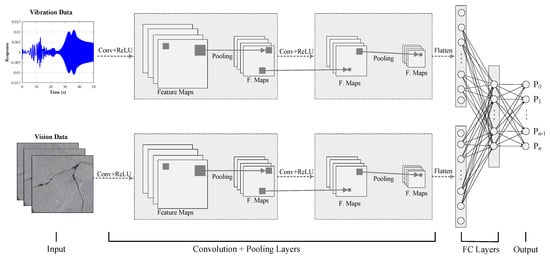 On the other hand, the DL-based SHM methods aim to develop fully automated feature extraction and hierarchical representation mechanisms from the raw input data through stacked blocks of deep neural network (DNN) layers with nonlinear mappings [,]. Each layer in a DNN is responsible for learning a new representation of the input response data and, thus, DL-based SHM is an end-to-end system with no requirement for human intervention for designing features. Therefore, all of the feature extraction, pattern classification, and regression parameters are simultaneously designed [], which makes DL-based SHM applicable to a wide range of problems with minimum knowledge about the specific features.