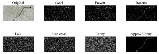 Prior to the introduction of DL in crack detection, the traditional approaches have been using pixel groups with similar color levels. The earlier generation of heuristic methods for vision-based crack detection in concrete structures was based on edge detection algorithms by applying filters, such as Roberts, Prewitt, Sobel, and LoG (in the spatial domain), or Butterworth and Gaussian (in the frequency domain) []. Figure 4 compares the results of applying different filters for detecting cracks on a concrete surface.
