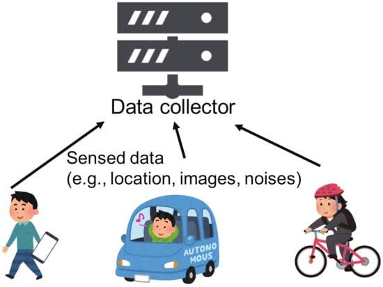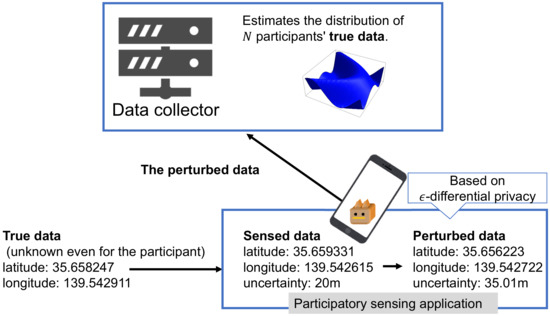 Several privacy-preserving techniques have been proposed for participatory sensing, such as in References [7,8]. By perturbing data based on -differential privacy [9,10] privacy leakage can be controlled. Differential privacy has been used in many studies, such as References [11,12,13], as it is one of the strongest privacy metrics [14].