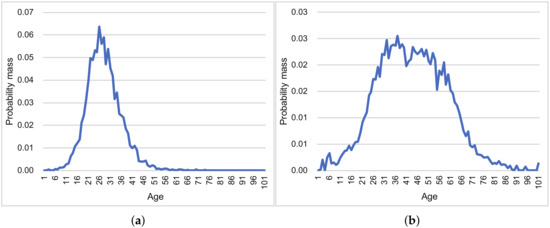 Figure 12 summarizes the results of this experiment. In both scenarios, the MSEs of the proposal were smaller than those of the other methods in almost all settings. The true and estimated data distributions are shown in Figure 13. The line of the proposal fits the true values’ line in Figure 13a,b.