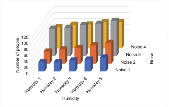 Assume that the number of bins for the first task is , and the number of bins for the second task is . In the example in Figure 14, = 4 and = 5. The data collector constructs for = 1, …, and = 1, …, , which represents that the reported values of the first and second tasks are categorized into th and th bins, respectively, while the true values of the first and second tasks are categorized into th and th bins, respectively. In the example in Figure 14, represents the probability that the reported values are “Noise 2” and “Humidity 1,” while the true values are “Noise 1” and “Humidity 3”.