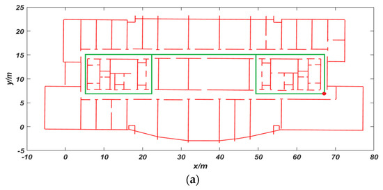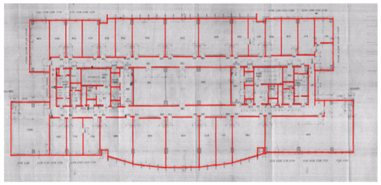 We need to process the indoor map before the experiment to obtain the discrete state of each moment. The indoor map is image format, which is not suitable for direct processing, so the software MapInfo is first used to convert the indoor maps from image format into digital format. The digital information of the indoor structure is obtained according to the calibration, projection, and description, and the digital information format is the endpoint coordinates of each line segment. The experiment site and map used are science building of Beijing University of Technology. The processed digital map is shown in Figure 3.
