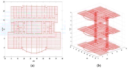 In order to improve the matching accuracy, we removed the states of those unreachable areas according to the specific situation of the indoor map. For example, if the vertices of the cells and cuboids in the map are too close to indoor impassable areas (such as walls, pillars, etc.), we will delete this state. Meanwhile, there are some constraints between the propagation of states. When the edge between two cell vertices passes through a previously unreachable area, the state cannot transfer directly. The processed map with states is shown in Figure 4, where, the red points represent the states, and the red lines represent the indoor structure.