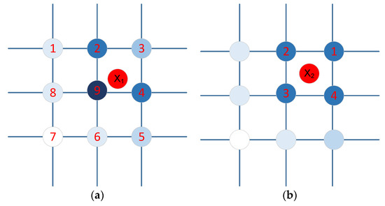 The state transfer functions represent the support degree of the observation for the transition between consecutive states. When an observation matches a state point, an obvious rule is that the smaller the distance to this state point, the greater the probability of this observation at this state point, and vice versa. As shown in Figure 5a, the red point is an observation value output by VIO, and the remaining points are the state points on the map. During the process of matching the state points, the dark color state points in the figure below indicate the points with higher matching probability, while the light color state points in the figure below indicate the points with a low matching probability. Another factor that affects matching is the heading information. As shown in Figure 5b, the four state points (1,2,3,4) around the observation value are the same distance from . At this time, we can use the information of heading information. The specific method is shown in Table 1.