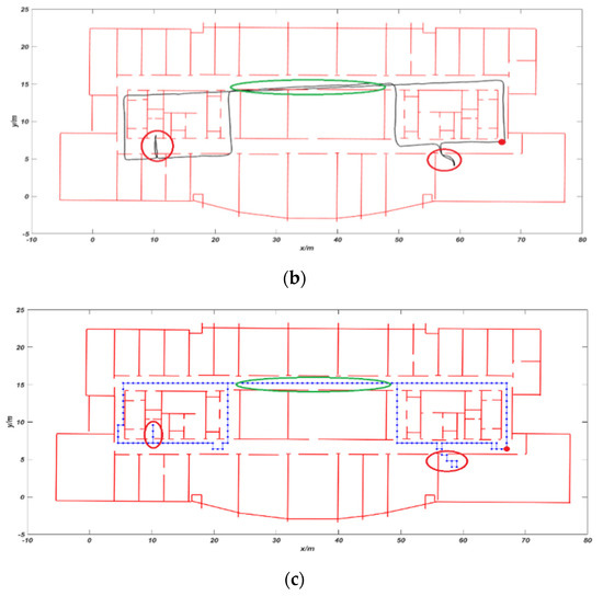Comparison of trajectory: (a) preset trajectory; (b) VIO trajectory; and (c) trajectory using the conditional random field (CRF) algorithm.