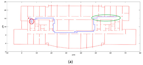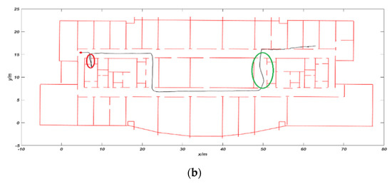 The first and second experiments were performed on the ninth floor of Science Building at Beijing University of Technology. The tester is a woman with a height of 1.63 m. She started from the red dot position, walked around the trajectory as shown in the Figure 7a, and eventually returned to the starting position. The average walking speed is 0.8 m/s. In Figure 7b, the black trajectory is the positioning trajectory of VIO. The red circle area is to enter the room. It can be seen that the trajectory of VIO is accurate at first, but the positioning accuracy of the green circle in the figure starts to decrease. After that, the pedestrian trajectory showed the serious phenomenon of passing through the wall. The main reason for the failure in positioning is that the surrounding environment of the aisle here is dominated by white walls and lacks visual valid texture information. The total distance of the experiment is 156 m, the mismatch rate reached 12.8%, and the cumulative error reached 4.26 m. The cumulative error is the Euclidean distance between the preset end point and the actual end point. The mismatch rate is the ratio between the mismatched state point and the actual total matched state point in the whole walking process. The blue trajectory in the Figure 7c is the VIO trajectory after using CRF feedback. The mismatch rate was reduced to 2.3% and the cumulative error was reduced to 0.61 m. The modified trajectory is more consistent with the indoor movement of pedestrians and basically corrects the phenomenon of the trajectory passing through the wall.