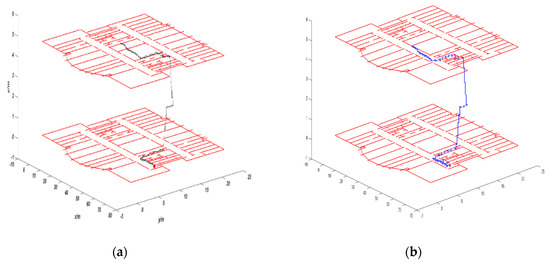 The third experiment was carried out on the ninth and 10th floors of Science Building in Beijing University of Technology. The tester is a man with a height of 1.7 5 m and the average walking speed is 1.0 m/s. The tester starts from the red dot on the ninth floor and go up the stairs to the 10th floor. The total distance is 59.2 m. Figure 9a is the trajectory of VIO output. As can be seen from the figure, after the floor changes, the height values of VIO trajectory have obvious drift phenomenon. The main reason is that the surrounding environment of the stair is mainly white walls, the texture information is relatively missing, and the maximum height error reaches 1.32 m. Figure 9b is the VIO trajectory corrected using the CRF model. The trajectory of the corrected VIO is significantly improved, and the cumulative height error is reduced to 0.2 6 m. Compared with the map matching algorithm in the study [25], we added the data of camera, so we achieved better accuracy. In study [26], the experiment was only carried out in the corridor and did not enter the room. In the study [27], the experiment was only performed on the same floor, and the 3D map matching is not realized.