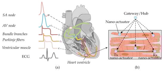 (a) Nodes from different parts of the heart produce diverse action potential signals. The composition of action potentials generates an ECG signal. (b) Nano-actuator pacemaker network in the heart ventricle: multiple nano-actuators are distributed in the ventricle and are coordinated by the gateway/hub. The nano-actuators are envisioned to share information to enhance their abilities []. The figure is adapted from an existing image provided by Servier Medical Art by Servier, licensed under a Creative Commons Attribution 3.0 Unported License.