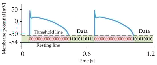 In this work, we explore the latter approach and use of membrane potential perturbations generated and propagated by cardiomyocytes when external stimuli and/or ion exchange occurs between the intra- and extra-cellular environments. In the considered scenario, if a stimulus applied to a targeted cardiomyocyte by a nano-actuator paces the heart, the cardiomyocyte should respond with action potentials. The action potential occurs when the membrane potential reaches the specified threshold values (typically −60 mV). Conversely, if a stimulus applied to the targeted cardiomyocyte by the nano-actuator is used to transmit data to another nano-actuator(s), the cardiomyocyte should respond by creating subthreshold membrane potentials. The subthreshold membrane potential thus refers to the membrane potential whose peak amplitude is below the specified action potential threshold. We envision the utilization of subthreshold membrane potentials in the time period between consecutive action potentials and use them as encoding signals (Figure 2). In other words, transmission happens during the ventricular diastole phase. Of note, the theoretical framework presented in the following applies to different types of cardiomyocytes, e.g., those originating from the ventricles or atria. Nonetheless, by adopting a set of cell-specific parameters for the numerical simulations, we present numerical results that applies to the ventricular cardiomyocytes only.