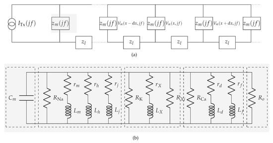 Equation (5) characterizes the membrane potential dynamics in the frequency domain at different propagation distances, where is the propagation constant expressed as [,]