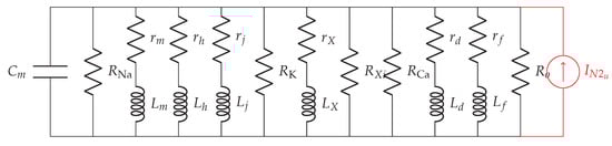where a denotes the radius of the cardiomyocyte strand. Aiming to define , we first inspect the transmembrane current components on a membrane patch (i.e., the currents that depend not only on membrane potentials but also on opening/closing of ionic channels, e.g., sodium, potassium, and calcium, and the currents that depend solely on membrane potentials), and then apply the quasi-active method [,,]. The linearized circuit for a membrane patch in a specific holding potential in the subthreshold regime ( mV) is shown in Figure 3b. Detailed linearization method used to define the circuit in Figure 3b is shown in Appendix A.1. Following Figure 3b, we now define