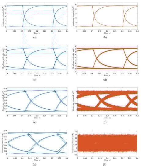 Selecting proper transmission rates in time bins intended for data transmission (Figure 2) is important to minimize intersymbol interference at the receiver point. For the system performance demonstration, we select the bit transmission rate of 5 bit/s to plot eye diagrams in Figure 7 considering different system parameters. An eye diagram is a tool used in communications engineering for the evaluation of the combined effects of inter-symbol interference and channel noise on the performance of a baseband signal-transmission system. An open eye diagram corresponds to minimal signal distortion. A closed eye diagram corresponds to signal distortion. We plot eye diagrams at different distances considering the noiseless and noisy scenarios, respectively. We observe that in short-distance transmission systems the eye openings are wide with plentiful margin decisions at the receiver regardless of the effect of noise (Figure 7a–d). As expected, however, the effect of noise combined with the increased distance among nano-actuators appears as the closure of the eye diagram with low-amplitude signals (Figure 7f,h). In such scenarios, highly sensitive receivers are required by the system to measure the low-amplitude signals. Of note, present high-performance microelectrodes could ideally measure potentials as small as 0.015 mV []. The completely closed eye appears in a noisy considered scenario where twelve cells compose the communication channel (Figure 7h).