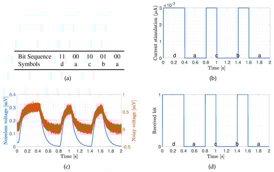 Transmission of bit sequence over ten cardiomyocytes with stimulation signal amplitude of 3 nA. The transmission bin of 2 seconds has been selected to demonstrate the system performance. (a) Sample bit sequence and associated symbols. (b) Transmitted signal. (c) Received signal. (d) Decoded signal.