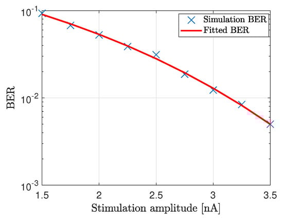 We now demonstrate coded data transmission over the channel composed of ten cardiomyocytes using Amplitude-Shift Keying. This modulation technique implies that binary 1 is represented by transmitting a fixed-amplitude wave for a fixed time duration; otherwise, binary 0 is represented. We select bits to represent a symbol, meaning that different symbols could be encoded, i.e., symbols ‘a’, ‘b’, ‘c’ and ‘d’ represented by 00, 01, 10 and 11, respectively. We randomly generate 1000 bits to ensure that the symbols are equally represented. The probabilities of the symbols ‘a’, ‘b’, ‘c’ and ‘d’ are 0.240, 0.254, 0.250 and 0.256, respectively. Figure 8a,b show a small portion of the transmission bit stream consisting of 10 bits. Figure 8c shows a small portion of the received bit stream consisting of 10 bits without and with the consideration of noise sources, respectively. We observe the positive effect of the noise when bit 1 is transmitted. This effect stems from the input-dependent noise that apparently enhances the cardiomyocyte stimulation. Conversely, we observe the negative effect of the noise when bit 0 is transmitted. This effect stems from the channel noise that decreases the margin decision. Nonetheless, with the proper threshold selected according to the eye diagram, the receiver can successfully decode the received signals to corresponding 1/0. As shown in Figure 8d, the receiver decodes the signal successfully in both scenarios. As of note, the performance is highly dependent on the stimulation amplitude. Based on randomly generated and transmitted 10,000 bits, we evaluate the bit error rate (BER) when changing the stimulation amplitude starting from 1.5 nA, as shown in Figure 9. As expected, the BER decreases with the stimulation amplitude and reaches the minimum value of 5 × 10 when the stimulation amplitude is 3.5 nA.