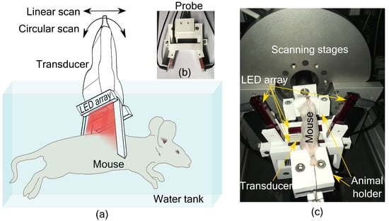 PA imaging using a linear transducer array suffers from low image quality due to incomplete acoustic detection. To overcome the limited view problem in linear array-based imaging, we recently developed a tomographic imaging configuration [11]. The system consists of an imaging probe with a linear transducer array and four LED arrays as shown in Figure 1a. Two LED arrays were placed parallel to the long axis of the transducer, geometrically pointing towards the focus of the transducer (20 mm depth). The other two LED arrays were placed on either side of the transducer along its short axis at an angle of 105° with the transducer surface. These two LED arrays were also placed at an angle of 5° with the imaging plane to minimize the acoustic reflections being detected. In this way, the object to be imaged is illuminated from three sides. The probe is then scanned around the object for tomographic imaging. Based on a simulation study, we have estimated that 16 angular views with an angular step of 22.5° is sufficient to form a full-view tomographic image [11]. The illumination configuration was also developed to provide a significant overlapping region between two angular scans. Interested readers can refer to the work in [11,12] for more details. A 3D printed holder encompassing the transducer and LED arrays to form the imaging probe is shown in Figure 1b. For small animal imaging, the probe was mounted on a motorized linear and circular scanning system, installed on top of a water tank as shown in Figure 1c. A 3D printed small animal holder was used to keep the mouse in place for imaging (Figure 1c).