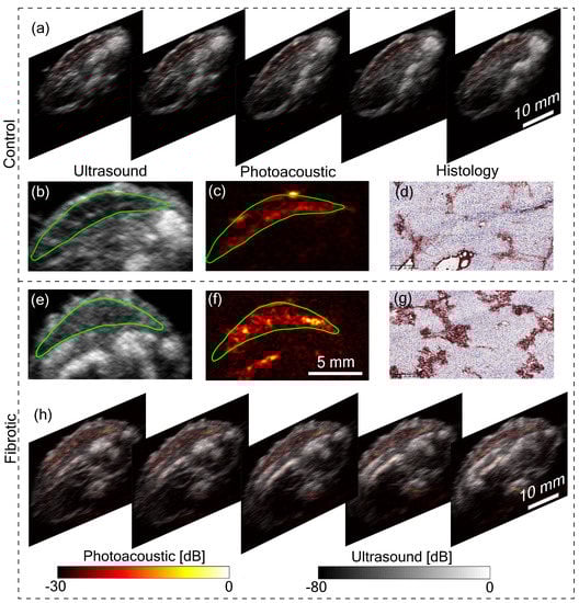 Tomographic imaging of the liver. (a) Tomographic photoacoustic and ultrasound images of a control mouse showing the liver at a scanning step of 2 mm. (b) Ultrasound image of the liver and (c) corresponding photoacoustic image. The green line markers the liver region. (d) Histology image of the control liver stained with Collagen I (fibrosis marker). (e) Ultrasound image of a mouse liver with fibrosis (CCl4-treated) and (f) corresponding photoacoustic image. (g) Histology image of the fibrotic liver stained with collagen I (fibrosis marker). (h) Tomographic photoacoustic and ultrasound images of the fibrotic mouse showing liver at a scanning step of 2 mm.