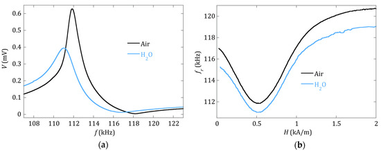 (a) Magnetoelastic resonance curves measured at H = 517 A/m, and (b) dependence of the resonant frequency () with the applied magnetic field, for the strip measured in air and when it is immersed in distilled water.