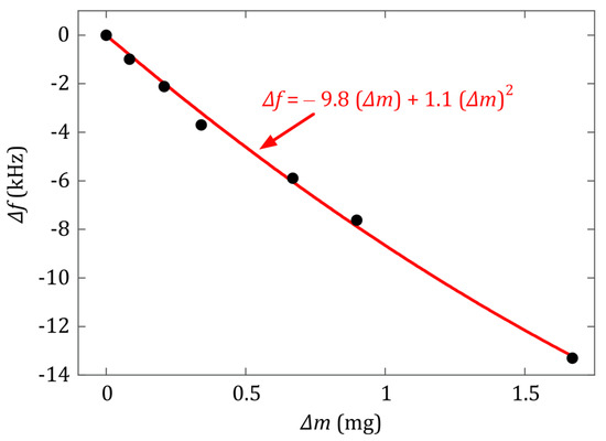 Calibration curve obtained from the changes in the resonance frequency of the resonator (measured in air), caused by different calcium oxalate mass depositions on its surface. Black dots represent the measured calibration points. The solid red line represents a fit to the second order expression of Equation (3), with coefficients a1 = −9.8 kHz/mg and a2 = 1.1 kHz/mg2.