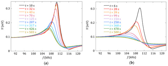 Measured magnetoelastic resonance curves of the sensor at different times during the precipitation process for solutions of oxalic acid and calcium chloride with concentrations of (a) 30 mM and (b) 100 mM.