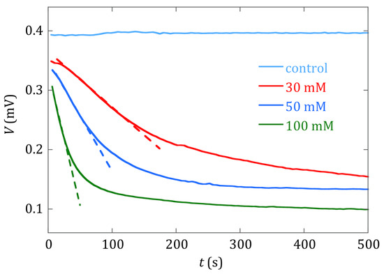 Temporal evolution of the amplitude (mV) of the measured signal (resonance amplitude), as the precipitation reaction progressed and precipitate crystals were deposited on the sensor surface. Curves are shown for different reactant concentrations (30 mM, 50 mM and 100 mM), and a control test (sensor in a vial with distilled water). Linear fits of the initial slope of each voltage curve are shown in dashed lines.