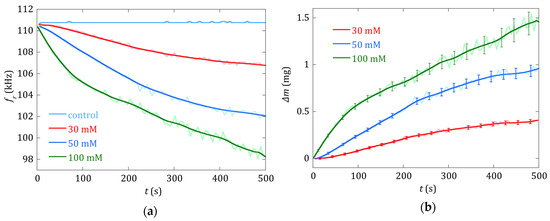 Finally, the change in the detected magnetoelastic resonance frequency, and the subsequently determined mass load, for the three solution concentrations presented in this study are shown in Figure 5. The deposited mass values were calculated from the resonance frequencies by applying the calibration expression given in Equation (3), using the fitting coefficients from Figure 2. The error bars in the figure are calculated as: