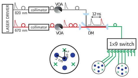 As schematically depicted in Figure 1, the system was based on two laser diodes controlled by the same laser driver (PDL 800, Picoquant GmbH, Berlin, Germany). They provided optical pulses at 40 MHz repetition rate at two different wavelengths ( 670 and 820 ). Each laser output was equipped with its own collimation stage, which also hosts the variable optical attenuator (VOA) to adjust the laser power injected into the fiber ( 100 core diameter). Each fiber was held on a tilting mechanical holder (for aligning purposes) and then one plano-convex lens (f = 30 , diameter 1 inch, Thorlabs, New Jersey, USA) was inserted to collimate the beam exiting from the fiber. To align both wavelengths onto the same path, a dichroic mirror (DM) with cut off wavelength at 805 (DMLP805, Thorlabs, New Jersey, USA) was inserted at 45 degrees (see Figure 1). The 820 beam was reflected by the dichroic mirror while the 670 one was transmitted and the fiber length was chosen so to separate the two wavelengths by about 12 ns delay (first: 820 ; second: 670 ). The free-space beam exiting from the dichroic mirror was then focused onto the 100 core input fiber of the switch using the same type of plano-convex lens as before to obtain a 1:1 imaging. Driven by a microcontroller, the switch (PiezosystemJena GmbH, Jena, Germany) continuously switches (< 30 ms switching time) the input over the nine outputs. Each of the eight outputs could be used as injection point, although in the proposed system only six of them were used (three per probe, see probes sketched in Figure 1). The switching of the output fiber was continuous and not synchronized with the acquisitions so to ensure a high speed rate needed to obtain real time tomography. Indeed, in less than one second all the six output channels were cycled, thus allowing one to perform tomographic reconstructions of the hemodynamics changes with a frame rate of > 1 Hz.