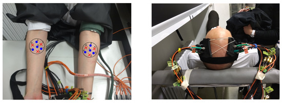 We carried out two different types of arm occlusion experiments: venous and arterial occlusion. Three healthy adult subjects (one female, two male), whose average systolic and diastolic pressure were between 120–130 mmHg and 80–90 mmHg, respectively, participated in the experiment. The probes were located on the forearm of the subjects (see Figure 2 left). The occlusion was performed using a manual blood pressure cuff that was placed on the left upper arm of the subjects. The venous occlusion protocol consisted of: 60 s resting, 30 s occlusion at 100 mmHg and 90 s recovery. This protocol was repeated three times per subject. Since the cuff pressure was not increased above the diastolic pressure only veins were blocked and, therefore, only the arm output blood flow was plugged.