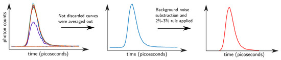 Pre-processing approach applied before analyzing the data. (1) From the 16 measured distributions of photons time-of-flight (DTOFs), the pre-switching curves were discarded. In the left image, first two curves were discarded (two noise lines at the bottom), third curve was also discarded (purple curve with low peak) and, finally, the fourth curve was still discarded to make the process more robust. (2) Not discarded curves were averaged out (middle image) and (3) the beginning and ending parts of the curves were trimmed (right image).