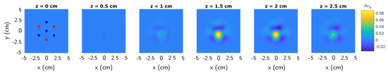 Since the phantom does not exhibit particular spectral fingerprints, the measurements were performed at a single wavelength (670 nm). The inclusion was located at 1.5 cm depth, (for 670 nm) and it was kept still during the measurement. The reconstruction performed with Mellin–Laplace moments (25 orders and ) is shown at Figure 4. The reconstructed inclusion was located at the right position: between 1.5 to 2 cm depth and at (the probe was put in a slight off-axis position). However, the absorption difference was considerably underestimated with respect to the expected values. This phenomenon has already been described in DOT literature [45]. Therefore, the following human brain cortex activation results will be examined in terms of localization and relative hemoglobin concentration changes. However, it will not be possible to obtain absolute quantification of hemoglobin concentrations.