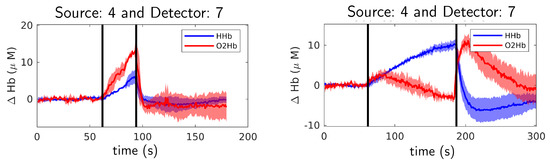 where is the path length. After, the oxygenated and deoxygenated hemoglobin concentration differences were obtained using molar extinction coefficients (see, for example, the standard procedures described in [36]). Regarding motor cortex activation experiments, we decided to use the time-of-flight moment since it is more sensitive to deep layers than CW signal [37]. The absorption difference can be obtained from time-of-flight moment by using a single-layer version of Equation (15) in [13],