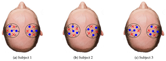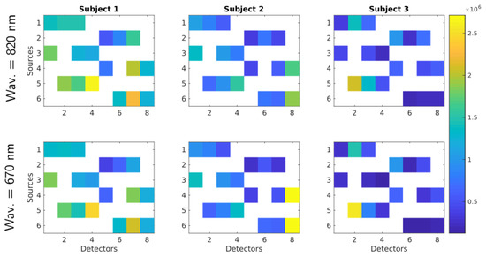 The differences in activation level among reconstructions of the three subjects can be explained due to (1) physiology reasons and (2) the count rate at the detectors. The first reason simply states that some subjects could have higher activation patterns than others. The second reason is depicted in Figure 10 where the average count rate over the three protocols for each wavelength and subject is shown (in Figure 7 the source and detector position for each subject are displayed). At first glance, it is evident that Subject 1 has a larger count rate for most channels in comparison with the rest of subjects. This was expected as Subject 1 is the unique bald subject between the three. Subjects 2 and 3 are not bald, but the hair distribution in the probed region was not homogeneous, thus giving rise to high signal only at some source-detector pairs. It is worth noting that the present system does not feature any equalization strategy at the level of the detector. The signal intensity can therefore be adjusted only by acting on the laser side with the variable attenuator. This forces the use, for each subject, of an amount of laser power that is within the single-photon statistics limit of TCSPC at the same time for all the detectors on the probes [55]. Thus, source-detectors pairs not covered by hair (yellow spots in Figure 10) affect the count rate of other pairs more covered by hair (blue spots in Figure 10). Therefore, Subjects 2 and 3 exhibit a proper count rate only for a few channels and in most cases the count rate is lower than one million counts per second. As a result of that, the measurements obtained from Subject 1 have a better signal-to-noise ratio and the tomography quality is much better.