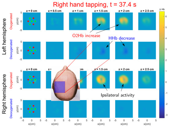 For right hand tapping, see Figure 9, activation is also seen at left hemisphere (see the Video S4 at Supplementary Material). The activation position is close to the C3 location over the tapping period for most repetitions (see Videos S5 and S6 with and concentrations for each repetition). The activation is located at similar depths such as left hand tapping. An increase of oxygenated blood is also seen at ipsilateral (right) hemisphere although there is no decrease of deoxygenated blood, for left hand tapping this ipsilateral effect could also be slightly seen. A similar phenomenon was also reported in [53]; the authors discuss that complex hand movements with dominant hand or simple hand movements with non–dominant hand tends to require more cortical activity and they also recruit some activity in the ipsilateral hemisphere. Similar conclusions are reached in [54], although they suggest that these differences disappear when subjects are overtrained.