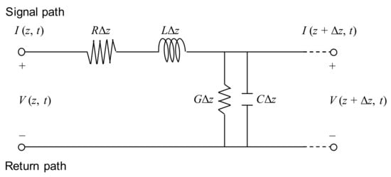 where V and I depict the voltage in volts and current in amperes, respectively; E and H represent the electric and magnetic field intensities, respectively; l is the conductor length. Given that V and I are expressed in terms of E and H, respectively, transmission line problems are solved with V and I instead of E and H for a simple and convenient calculation. Transmission line equations are obtained by applying Kirchhoff’s voltage and current laws []: