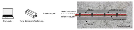 Most rock bolts are made of steel rebars, which are a conductive material that allows the flow of electrical current. In this study, a two-conductor transmission line was configured with a rebar and an electrical wire, as shown in Figure 2. The SD 300 deformed steel rebar employed in this study has a diameter and length of 25.4 mm and 3.01 m, respectively. The two-conductor transmission line was configured by installing the electrical wire alongside the rebar. Electrical tapes were used to fix the electrical wire to the rebar at intervals of 0.2 m. The electrical wire is a single-conductor electrical wire composed of one piece of metallic conductor surrounded by plastic insulation. The metallic conductor was made of a flexible stranded annealed copper with a diameter of 2.1 mm. The plastic insulation constituted nonconductive material made of polyvinyl chloride (PVC) with a thickness of 0.8 mm. The velocity of electromagnetic waves in the rebar, where the transmission line was configured, was 2.649 × 108 m/s, which is approximately 88.3% of the velocity of electromagnetic waves in vacuum (3 × 108 m/s).