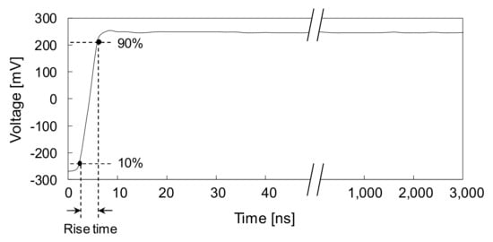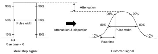 The electromagnetic waves traveling in a transmission line comprise various frequencies, and their velocity can be changed by altering the frequency. This phenomenon is referred to as signal dispersion. The dispersion therefore occurs regardless of whether the medium is lossy or not. The dispersion increases the velocity in higher-frequency components, resulting in a decrease in the pulse width and in an increase in the amplitude (i.e., the pulse width is reduced, while the energy remains constant). In contrast, the dispersion decreases the velocity in the lower-frequency components (i.e., the pulse width is increased, while the energy remains constant) [,]. Signal distortion generally occurs due to both attenuation and dispersion. As electromagnetic waves propagate through lossy medium, the higher-frequency signal components are attenuated, whereas the lower-frequency signal components remain constant []. Thus, the bandwidth of the signal decreases, whereas its rise time increases. Finally, the signal energy is reduced with increasing pulse width, as shown in Figure 4.