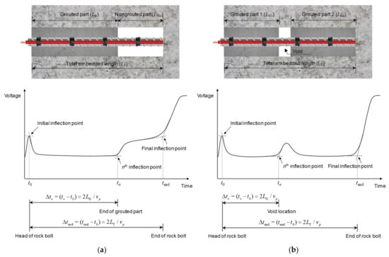 In the cases of defective rock bolts with non-grouted parts at the ends, signal reflections at the interfaces between grouted and non-grouted parts appear with the same sign as the input signal. The propagation of electromagnetic waves is affected by the dielectric constant of air in non-grouted parts (i.e., defect), whereas in grouted parts it is affected by the dielectric constant of the cement grout. Notably, the dielectric constant of air (εr ≈ 1) is smaller than that of the cement grout (εr ≈ 4.5). The electrical impedance is inversely proportional to the dielectric constant, as described in Equation (17). The electrical impedance in the grouted parts is therefore smaller than that in the non-grouted parts. Thus, signals reflected from non-grouted parts, where the electrical impedance is larger than in the grouted parts, appear with the same sign as the input signal, as described in Equation (16). In cases of defective rock bolts with voids, voids generate two neighboring discontinuities on rock bolts: (1) the beginning of the void; (2) the end of the void. Thus, the reflections of the signals appear with the same phase at the beginnings of the voids, while they appear with the opposite phase at the ends of the voids.
