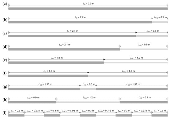 In this study, the severity of the defect in the rock bolt was expressed by the non-grouted ratio. The non-grouted ratio (NGR) was defined as the ratio of the sum of the length of non-grouted parts (LNG) to the total length of the rock bolt (LT):