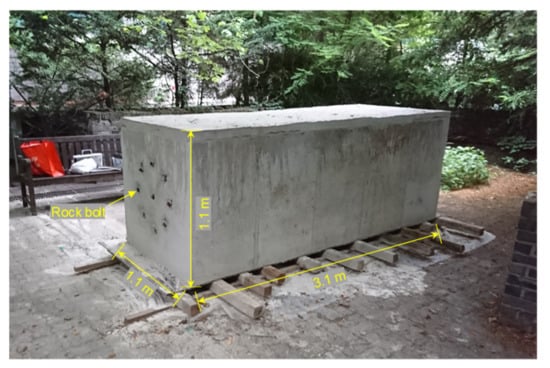 Concrete block with installed rock bolts for simulation of rock mass.
