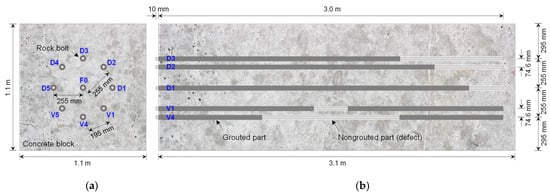 The single fully grouted rock bolt and eight defective rock bolts in the non-embedded condition were finally embedded in a concrete block (see Figure 8) to simulate rock bolts installed in rock mass. Non-grouted parts were covered with PVC pipes to prevent them from being filled with concrete. Therein, a cuboid mold to cast a concrete block was constructed with steel panels (euro-form); the fully grouted rock bolt was then suspended at the center of the mold using nylon ropes; in the same manner, the eight defective rock bolts were arranged in a circular shape at equal intervals around the fully grouted rock bolt; concrete was then poured into the mold, and the mold was removed after curing for 28 days. The distance between the fully grouted rock bolt and defective rock bolts was set to be 255 mm, as shown in Figure 9a. The interval between defective rock bolts was set at approximately 195 mm. The embedded length of 3.01 m long rock bolts installed in the concrete block was 3.0 m, while the 10 mm length for the connection of the coaxial cable at the heads of rock bolts was exposed to air, as shown in Figure 9b. The length, width, and height of the concrete block were 3.1, 1.1, and 1.1 m, respectively. The compressive strength and dielectric constant of the concrete at 28-day curing were approximately 35 MPa and 4.2, respectively. The effects of PVC pipes on the propagation of electromagnetic waves were minor because the dielectric constant of the PVC pipe (εr ≈ 4) is similar to that of concrete (εr ≈ 4.2) [].